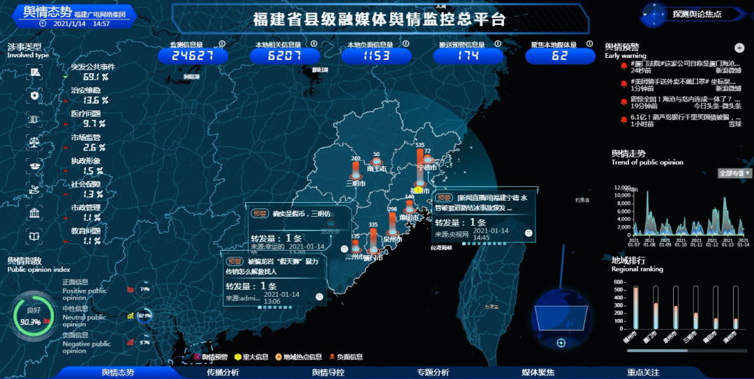 在省委宣傳部的關(guān)心和指導(dǎo)下,福建廣電網(wǎng)絡(luò)集團(tuán)構(gòu)建的福建省縣級(jí)融媒體總平臺(tái),以內(nèi)容建設(shè)為根本、先進(jìn)技術(shù)為支撐、創(chuàng)新管理為保障,迅速推動(dòng)福建省媒體融合向縱深發(fā)展。截至目前,全省 84 個(gè)縣(區(qū))全部完成省級(jí)平臺(tái)接入。省級(jí)平臺(tái)建成的融媒 APP 云工場(chǎng)、輿情監(jiān)測(cè)預(yù)警和大數(shù)據(jù)分析云平臺(tái)處于行業(yè)領(lǐng)先水平。