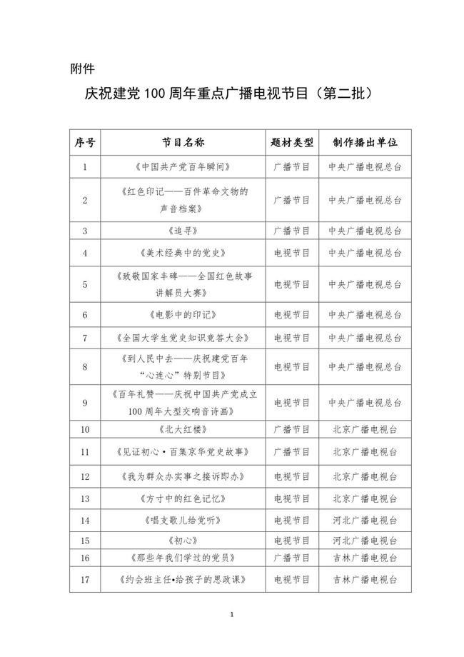 “七一”臨近,慶祝建黨百年氛圍日益濃厚,廣播電視建黨百年主題節(jié)目陸續(xù)播出,產(chǎn)生了良好反響。為進一步推進慶祝建黨百年主題廣播電視節(jié)目創(chuàng)作播出,廣電總局聚焦主題,從思想內(nèi)涵、構思創(chuàng)意、藝術呈現(xiàn)上擇優(yōu)篩選,確定了《中國共產(chǎn)黨百年瞬間》《美術經(jīng)典中的黨史》《方寸中的紅色記憶》等32檔慶祝建黨100周年重點廣播電視節(jié)目(片目附后)。