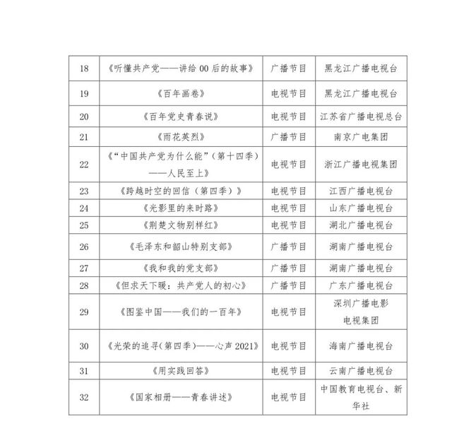 近日,國家廣播電視總局辦公廳發(fā)布《關于進一步做好慶祝建黨100周年廣播電視節(jié)目創(chuàng)作播出工作的通知》。通知提到,廣電總局聚焦主題,從思想內(nèi)涵、構思創(chuàng)意、藝術呈現(xiàn)上擇優(yōu)篩選,確定了《中國共產(chǎn)黨百年瞬間》《美術經(jīng)典中的黨史》《方寸中的紅色記憶》等32檔慶祝建黨100周年重點廣播電視節(jié)目。